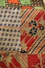 Beautiful and imperfect. Old and intricately stitched. Each of these reversible Indian kantha quilts is handmade from vintage saris, pieced and matched, patched and sewn with a simple running stitch known as "kantha". Small imperfections, darns and threads, patches and stains are part of their history and are what make these ethnic textiles unique. We do not consider them defects but beauty spots.
